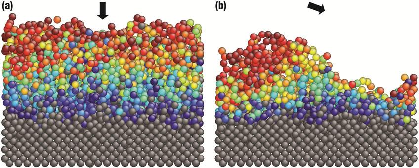 A 100A radius silica tip makes contact with a silica substrate, coated with a self-assembled monolayer of alkyl silanes for a study of friction and wear. The snapshots were made with VMD, and show deformation and damage to the coating layer due to the tip.