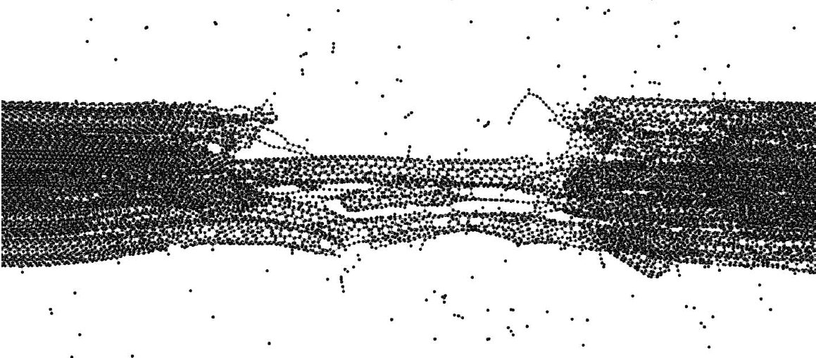 This is work by Joerg Rottler (now at Princeton) and Mark Robbins at JHU. The image shows a polymer glass that has been deformed into a craze at large strains. In the craze, polymers (~0.5 nm diameter) are bundled into an intricate load-bearing network of ~10 nm diameter fibrils. Crazing is largely responsible for the high fracture energy of glassy polymers.