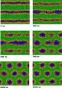 These images show the resulting strained system after deformation via 3 different paths. The top images color the atoms in each crystal in 2 shades of gray; the bottom images color atoms by the distance they moved from their initial positions.