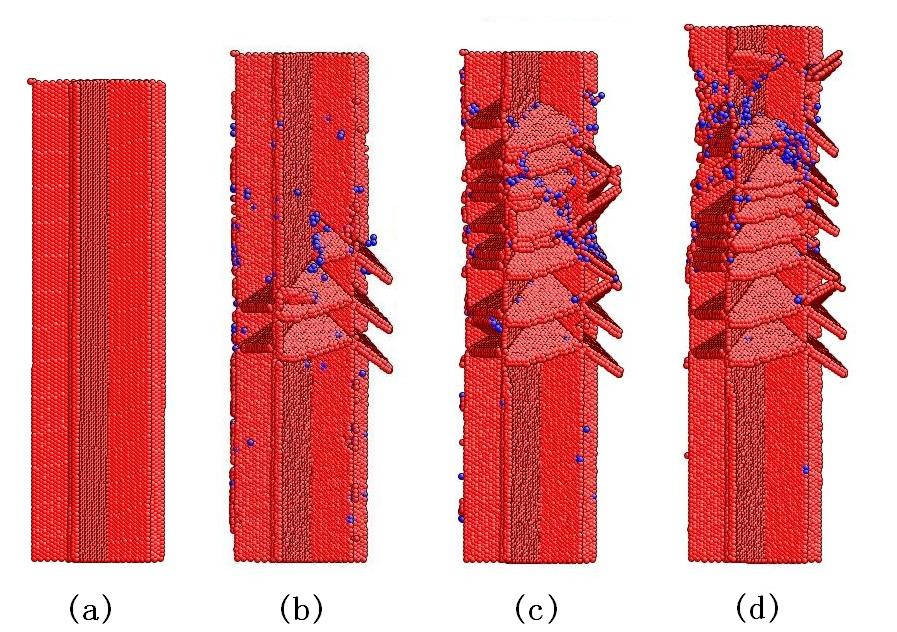 This is work by Min Zhou's group at Georgia Tech on modeling the effect of tensile stress at varying strain rates on single-crystal Cu nanowires of varying dimensions. In the image, atoms are colored to highlight defects and the transverse dimensions are drawn at an exaggerated scale.