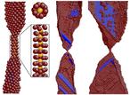 The picture on the left is the equilibrium structure of a nanowire constructed with a fivefold twinned grain boundary running down the axis of the wire. Tensile stress is applied. The picture in the middle shows the resulting dislocation pile-up. The picture on the right shows a different geometry where twin boundaries are oriented perpendicular to the axis of the nanowire. Atoms are colored according to the configuration of their neighbors; the visualization was done with the AtomEye program.